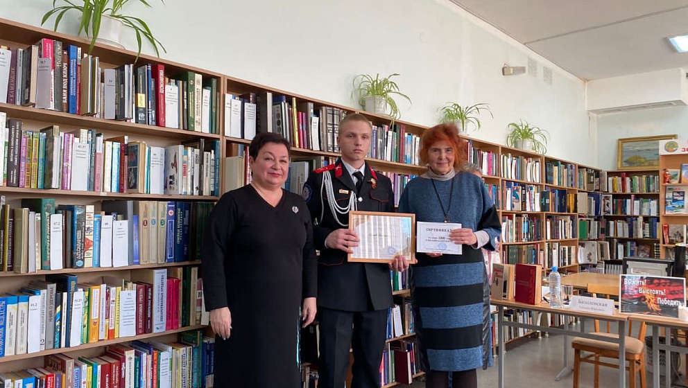 Первое место в номинации «Стихотворения известных поэтов» единогласно было присуждено воспитаннику Бриньковского Кадетского корпуса Дмитрию Цапкову, который покорил сердца слушателей безупречным уверенным выступлением. Дмитрий в течение ряда лет, начиная с младших классов, принимал участие в творческих программах нашей библиотеки. Сегодня прозвучало мощное стихотворение Анатолия Молчанова «Приказано выжить».