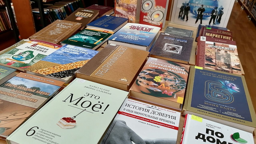 Особое место на выставке занимают издания, посвященные экономическим вопросам нашего региона. Для интересующихся читателей можно рекомендовать книгу В.Н. Ратушняка «Северо-западный Кавказ в условиях рыночной экономики», издание «Потребительская кооперация Кубани», авт. В.Ф. Дуплякин, «Сельское хозяйство Кубани: прошлое и настоящее» и другие издания.