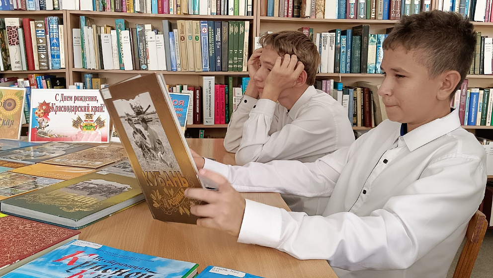 К этому событию, в читальном зале районной библиотеки, для учащихся МАОУ СОШ № 22, прошло мероприятие, в ходе которого ребятам рассказали и показали документальные видеоматериалы об истории образования Краснодарского края.