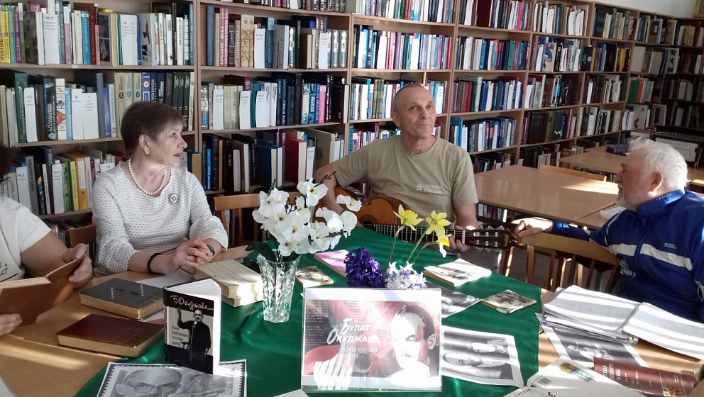 Участники объединения собрались, чтобы поговорить, прочесть стихи и спеть песни любимого поэта, автора и исполнителя собственных песен Булата Окуджавы. 9 мая 2024 года исполнится 100 лет со дня его рождения.
