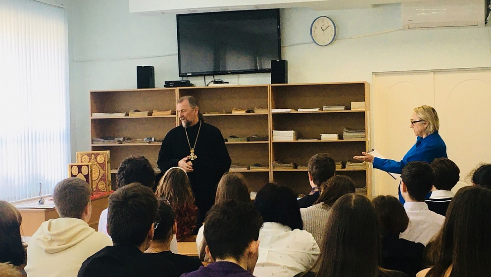 Настоятель храма Воскресения Словущего г.Приморско-Ахтарска, благочинный Приморско-Ахтарского округа протоиерей Иоанн Феер рассказал студентам техникума индустрии и сервиса о возникновении книгопечатания на Руси, о первопечатнике диаконе Иване Фёдорове, о первой печатной книге «Апостол».
