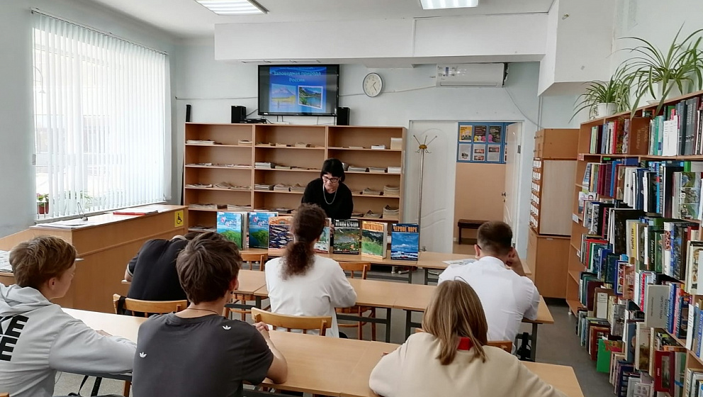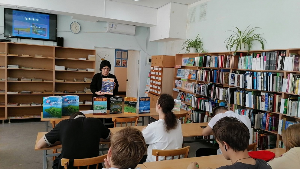 Учащихся знакомили с яркими иллюстрированными книгами из фондов библиотеки, которые содержат ценные сведения об обитателях и растительности Азовского моря. Особое внимание ребят обратили на новое красочное издание Красной книги Краснодарского края, с уникальными цветными фотографиями. Рассказ библиотекаря сопровождала видеопрезентация о заповедниках края.