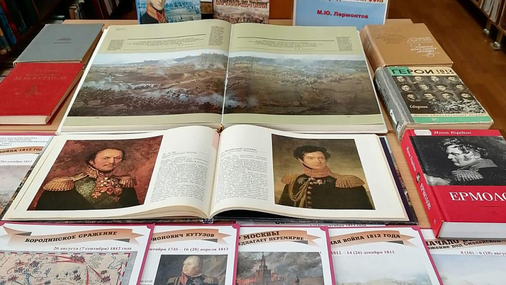 С 3 сентября в нашей библиотеке открыта выставка «Великий день Бородина», на которой представлены книги из фондов библиотеки, отражающие тему Отечественной войны 1812 года и Бородинского сражения.