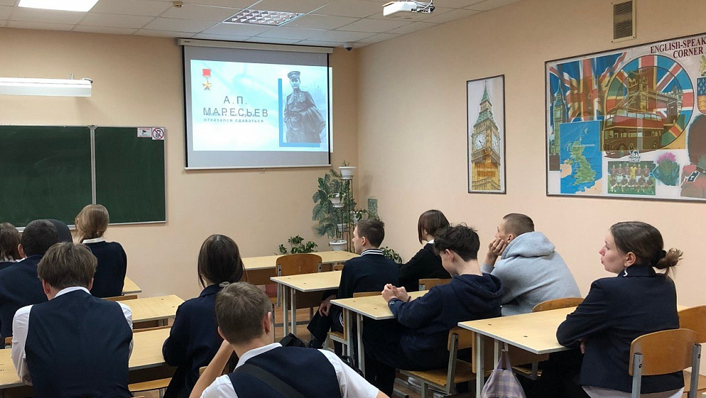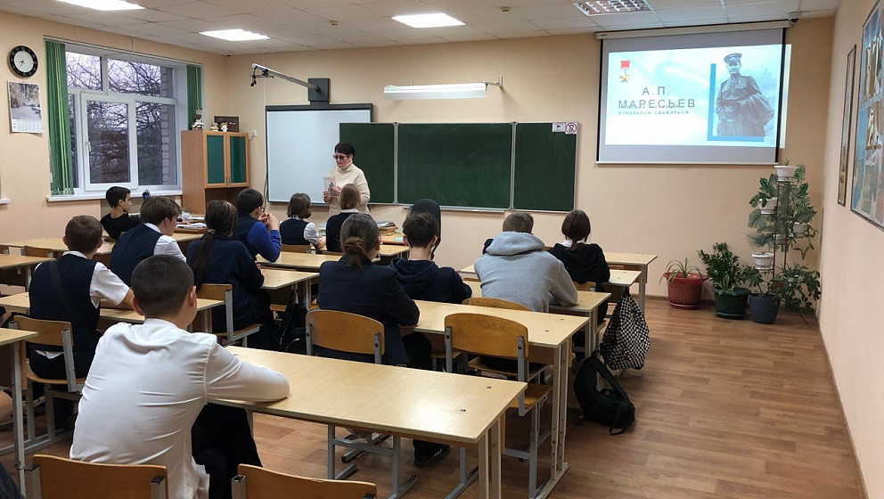 В школе № 22 прошел исторический час «Жизнь как подвиг», посвященный 110-летию прославленного летчика. Библиотекарь Кирсанова Тамара Прокопьевна рассказала ученикам о жизни героя, который во время боевого задания лишился обеих ног. Сила воли и стремление к жизни сумели победить смерть. Летчик выжил, вернулся в авиацию, снова сел за штурвал истребителя и воевал.