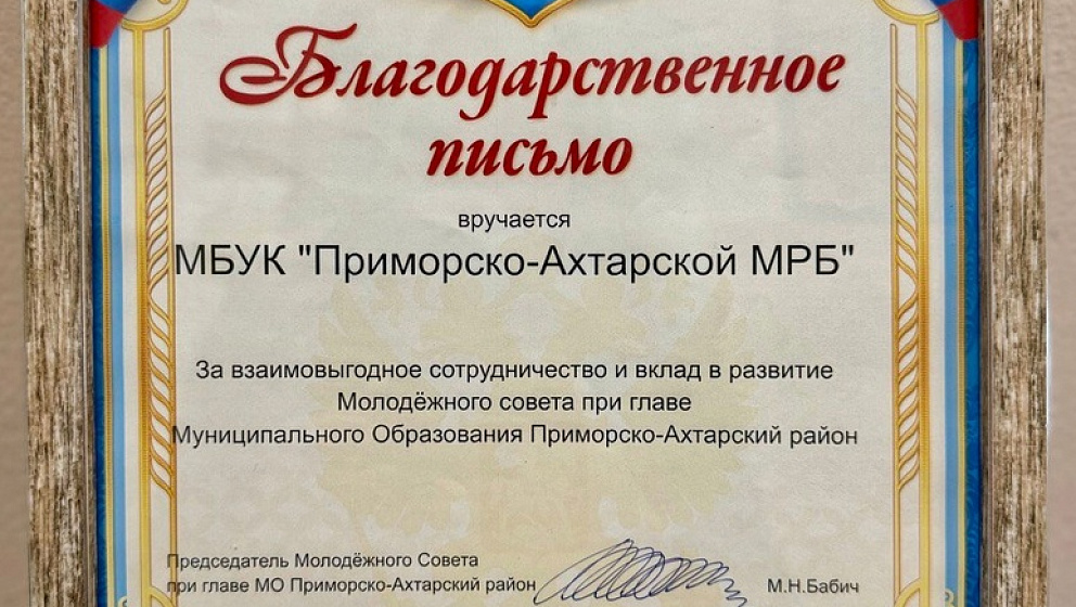 В Общероссийский день библиотек Председатель Молодёжного Совета при главе муниципального образования Приморско-Ахтарский район Михаил Бабич поздравил коллектив Приморско-Ахтарской районной библиотеки с профессиональным праздником и вручил благодарность за взаимное сотрудничество и вклад в развитие Совета.