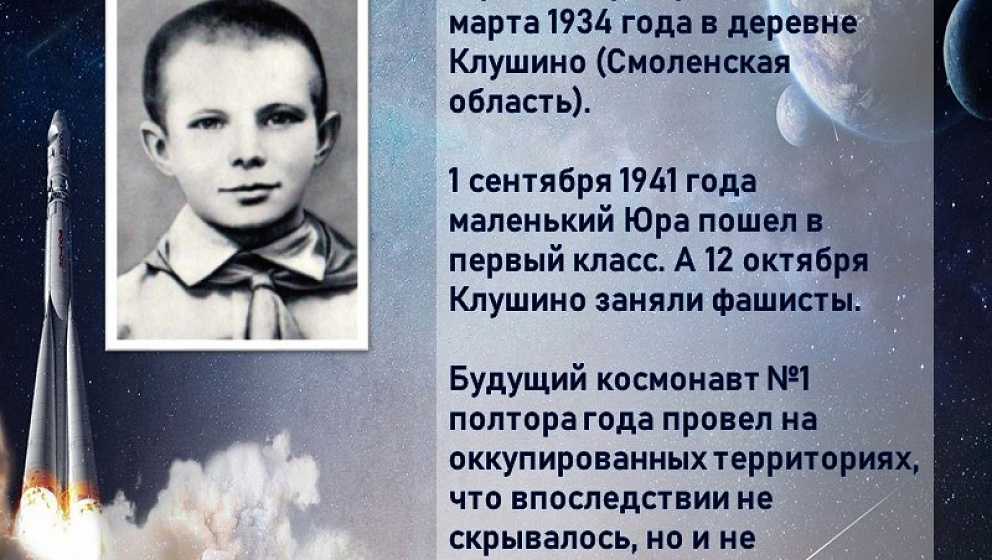 Его имя знает каждый: Юрий Алексеевич Гагарин (1934-1968)! Летчик-космонавт СССР, Герой Советского Союза, кавалер высших знаков отличия ряда государств, почетный гражданин многих российских и зарубежных городов, полковник ВВС СССР, военный летчик 1-го класса, заслуженный мастер спорта СССР…