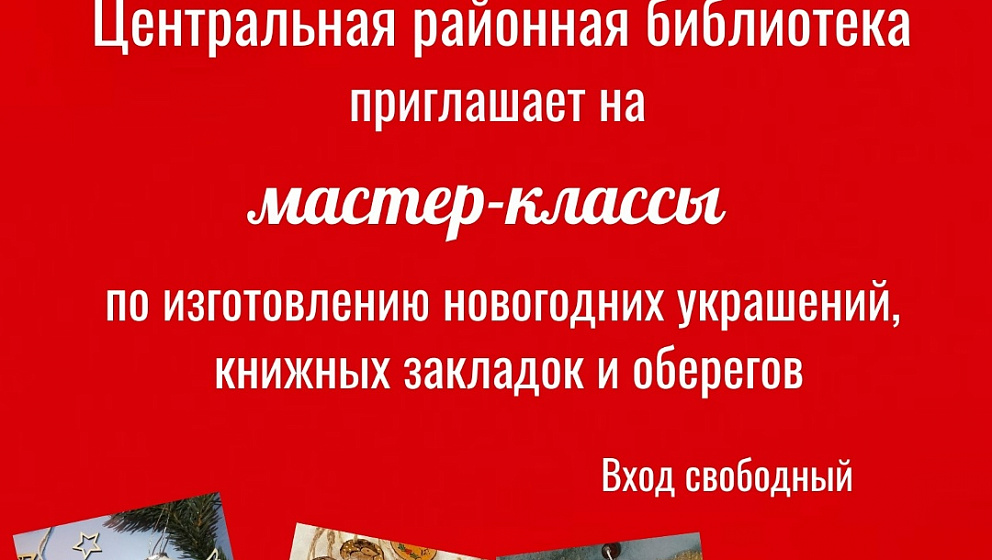 Приморско-Ахтарская центральная районная библиотека приглашает на мастер-классы по изготовлению новогодних украшений, книжных закладок и оберегов 9 января с 12:00 до 18:00 часов.