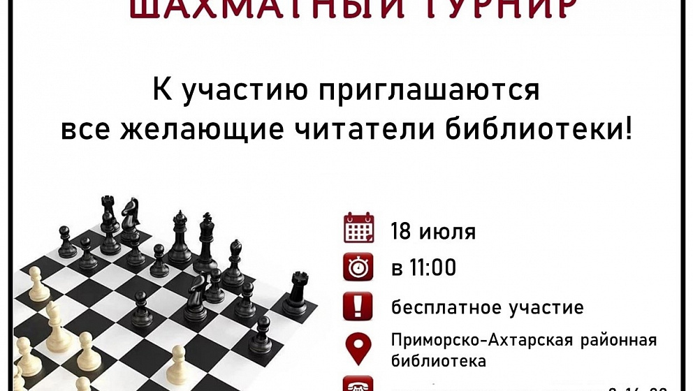 18 июля в 11:00 часов в Приморско-Ахтарской районной библиотеке состоится турнир по шахматам, приуроченный к Международному дню шахмат.