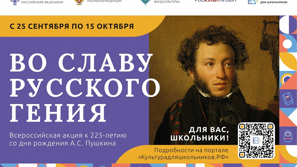 С 25 сентября по 15 октября 2024 г. в рамках межведомственного культурно-образовательного проекта «Культура для школьников» пройдет Всероссийская акция «Во славу русского гения».
