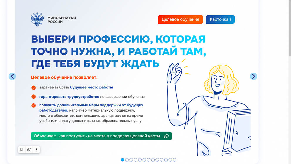 Указанный подраздел предназначен для работодателей, образовательных организаций, абитуриентов, обучающихся и содержит агрегированную информацию по вопросам целевого обучения, включающую записи вебинаров, презентационные материалы, методические рекомендации и официальные письма Минобрнауки России.
