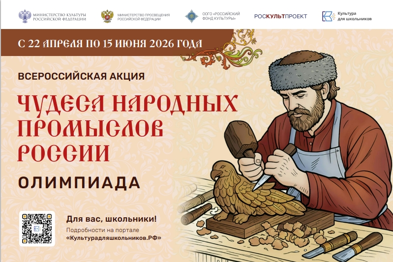 С 22 апреля по 15 июня 2026 года в рамках культурно-образовательного проекта «Культура для школьников» пройдет всероссийская акция «Чудеса народных промыслов России. Олимпиада». Главный консультант мероприятия - лауреат II Всероссийской общественной премии «Гордость нации» Жанна Андриевская.