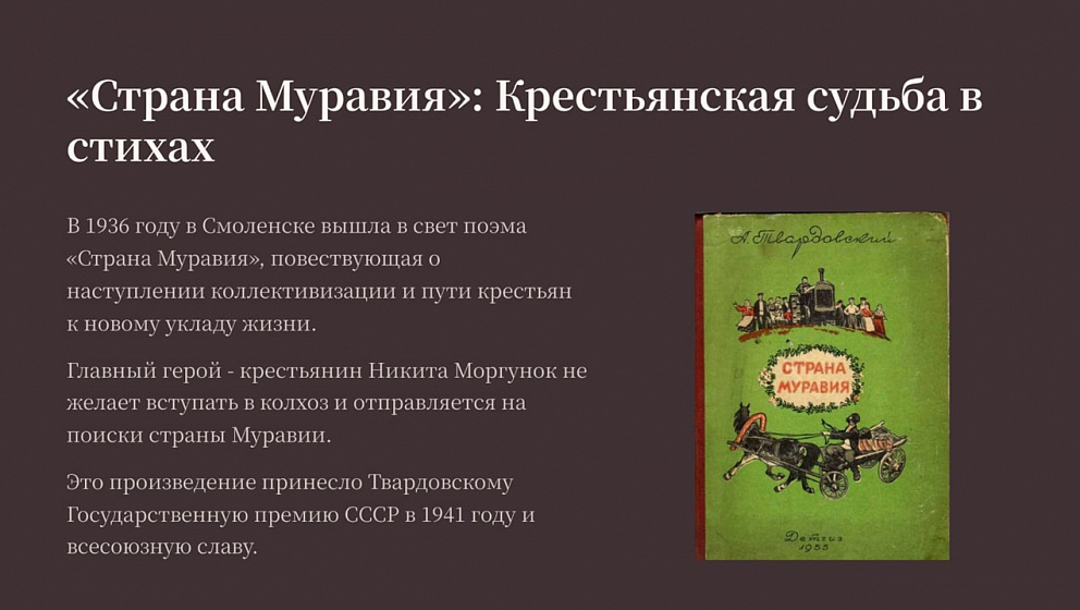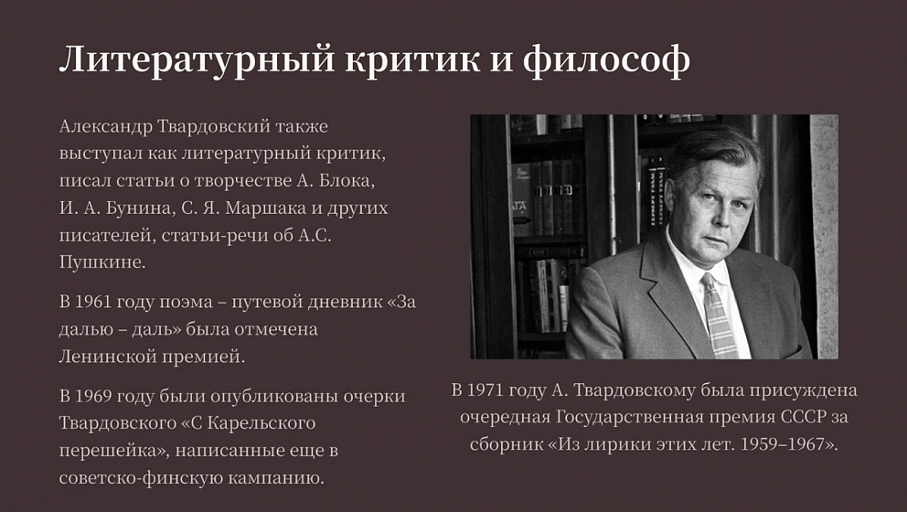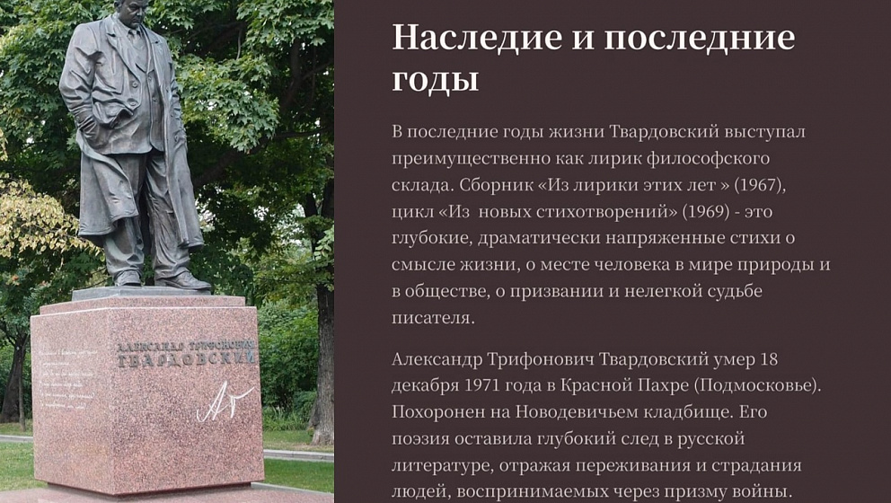 Его называли классиком соцреализма и выразителем передовых идей и чаяний своего времени. Участник Советско-финской и Великой Отечественной войны А.Т.Твардовский в качестве военного корреспондента прошел боевой путь от Москвы до Кенигсберга, встретив Победу в звании подполковника Красной Армии.