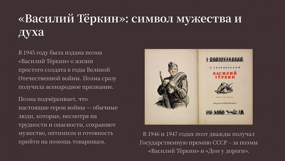 Его блестящие фронтовые очерки поднимали боевой дух солдат. Своим творчеством писатель смог ухватить сердцевину войны и героизма русского характера. А поэма «Василий Тёркин» стала самым известным произведением поэта. Она принесла ему большой успех и всенародное признание.