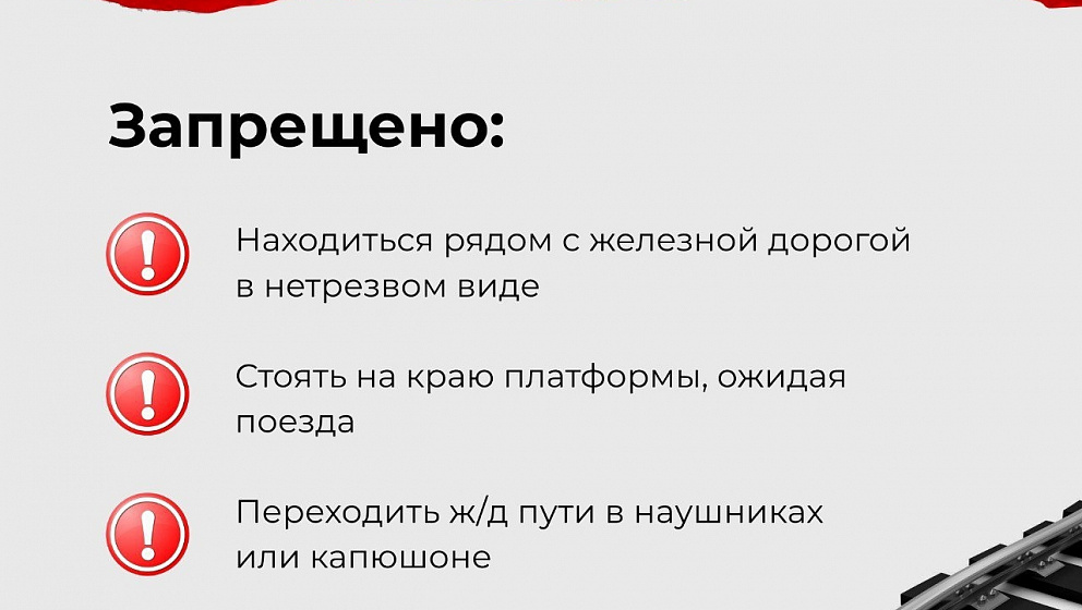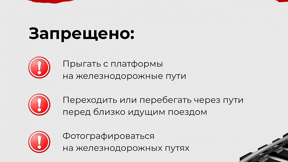 - Железнодорожные пути являются объектами повышенной опасности. Находясь на них, вы подвергаете свою жизнь риску. Никогда не переходите через железнодорожные пути в неустановленных местах, не оборудованных для этого местах, не перебегайте перед проходящим поездом. Помните, что поезд сразу остановить нельзя.