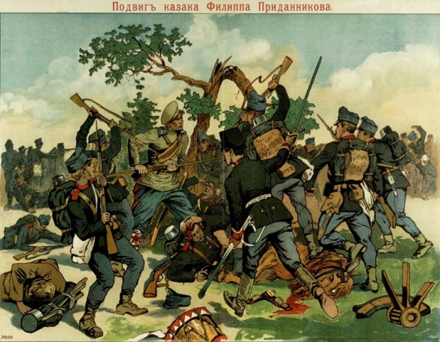Сейчас имя казака Филиппа Приданникова почти забыто, однако в годы Первой мировой войны по известности он немногим уступал легендарному Козьме Крючкову. В одном из боев за Галицию австрийский снаряд раздробил ногу Филиппа и убил под ним лошадь. Несмотря на это, казак продолжал биться — он заколол пикой трёх австрийцев, в затем саблей зарубил еще троих. После этого Филипп упал без сил. Его доставили в Киев, где наградили орденом Святого Георгия.