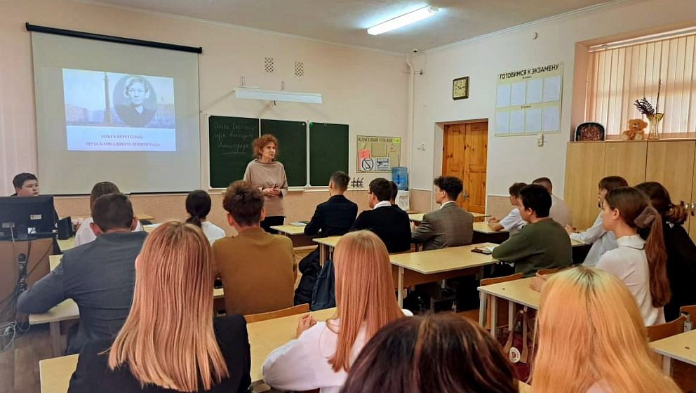 В заключение мероприятия десятиклассникам был предложен просмотр конкурсного видеоролика «Муза блокадного Ленинграда», подготовленного работниками библиотеки, на протяжении которого звучат стихи Ольги Берггольц.