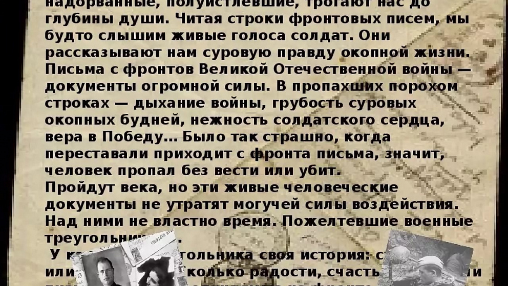 Фронтовые письма помогают увидеть войну изнутри. Слова, которые мы слышим через десятилетия из прошлого, обращены к нам, живым, они связывают наши судьбы.