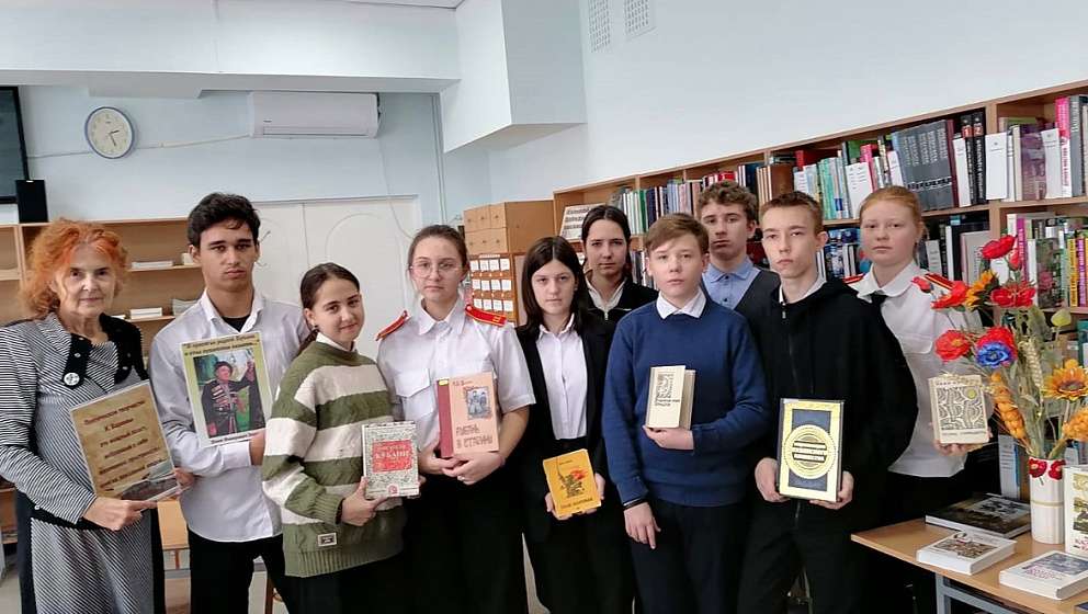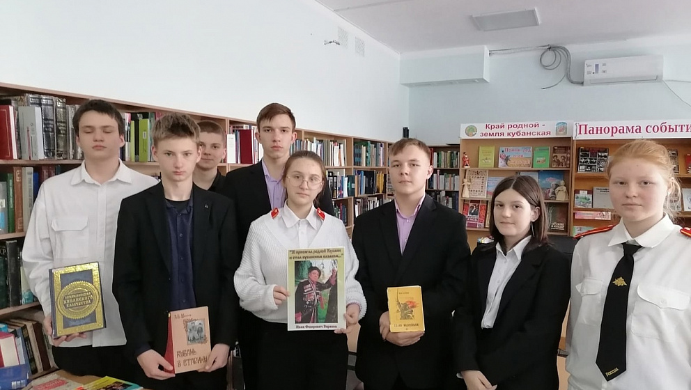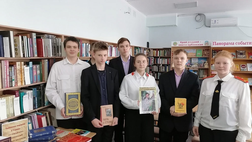 К 100-летию писателя в библиотеке открылась выставка его книг, у которой специалисты библиотеки провели со школьниками беседу о наследии кубанского кобзаря.