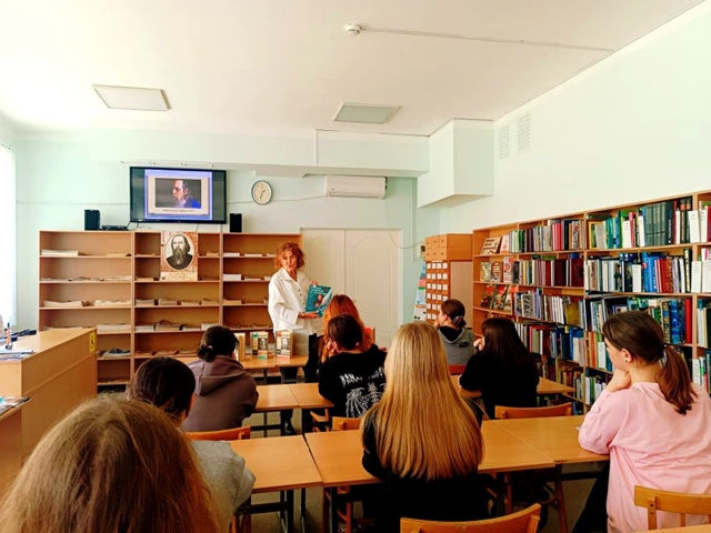 Специалист библиотеки Базилевская Т.Ю. рассказала первокурсникам о жизни и литературной деятельности Щедрина, дополнив материал интересными фактами, почерпнутыми из библиографических изданий библиотеки. Рассказ сопровождался слайд-презентацией «Салтыков-Щедрин. Очерки жизни и творчества».