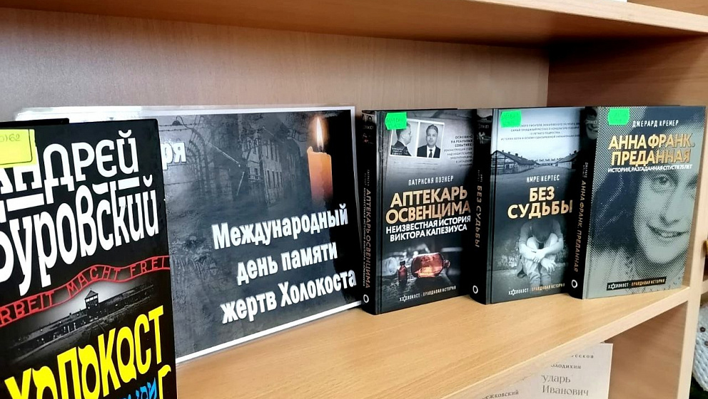 К этому событию на абонементе библиотеки оформлена выставка-память «Трагедия Холокоста – жить и помнить». На ней представлены новые книги, которыми недавно пополнился фонд библиотеки и литература прошлых лет, рассказывающие об одной из страшных трагедий в истории человечества: