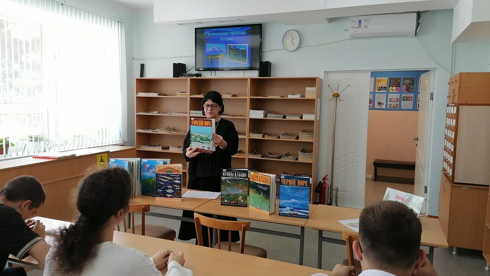 Учащихся знакомили с яркими иллюстрированными книгами из фондов библиотеки, которые содержат ценные сведения об обитателях и растительности Азовского моря. Особое внимание ребят обратили на новое красочное издание Красной книги Краснодарского края, с уникальными цветными фотографиями. Рассказ библиотекаря сопровождала видеопрезентация о заповедниках края.
