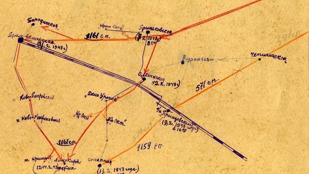 На фото изображен наш земляк Иван Сучков, который был участником освобождения Приморско-Ахтарского района, воевал в 1942 году в составе 1161 горнострелкового полка 351 стрелковой дивизии. Именно его рукой начерчена карта освобождения Приморско-Ахтарского района.