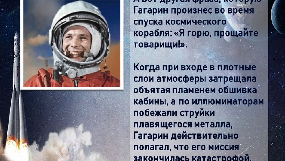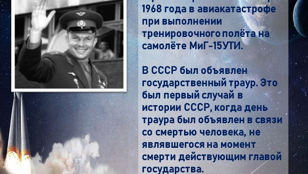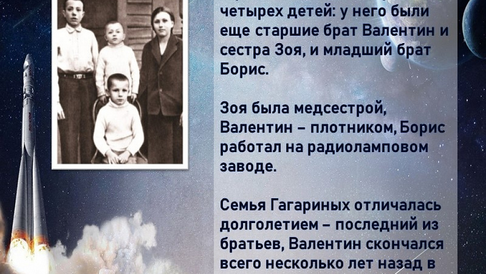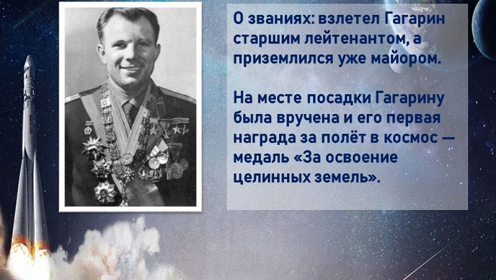 Его имя знает каждый: Юрий Алексеевич Гагарин (1934-1968)! Летчик-космонавт СССР, Герой Советского Союза, кавалер высших знаков отличия ряда государств, почетный гражданин многих российских и зарубежных городов, полковник ВВС СССР, военный летчик 1-го класса, заслуженный мастер спорта СССР…