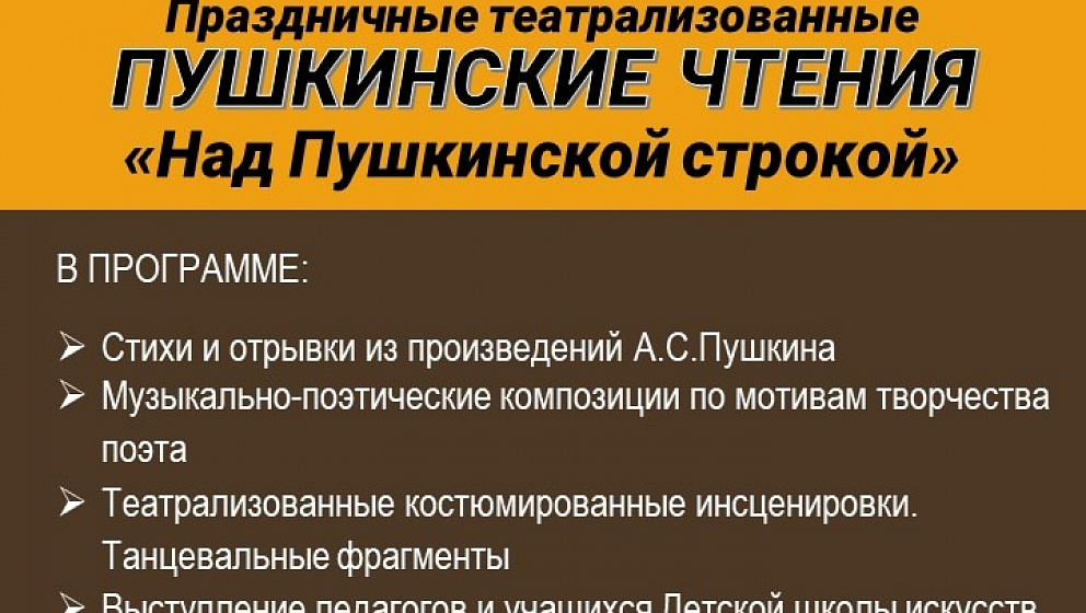Учащаяся молодежь разного возраста, студенты техникумов «Знание» и ПАТИС, взрослые читатели будут читать стихи и прозу А.С. Пушкина. Прозвучат музыкально-поэтические композиции по мотивам творчества поэта, будут показаны театрализованные отрывки из его произведений.