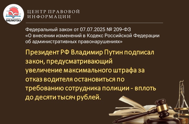 Президент РФ Владимир Путин подписал закон, предусматривающий увеличение максимального штрафа за отказ водителя остановиться по требованию сотрудника полиции - вплоть до десяти тысяч рублей.