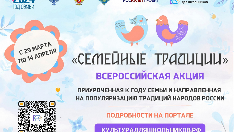 В рамках межведомственного культурно-образовательного проекта Министерства Культуры РФ и Министерства Просвещения РФ "Культура для школьников" с 29 марта по 14 апреля 2024 года пройдёт Всероссийская акция "Семейные традиции", приуроченная к Году семьи и направленная на популяризацию традиций народов России.