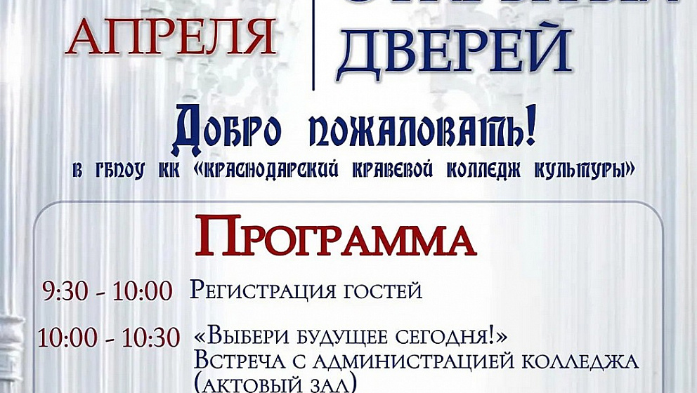 4 апреля Краснодарский краевой колледж культуры приглашает на День открытых дверей! Если вы хотите получить профессию в сфере культуры — это отличный шанс познакомиться с колледжем, преподавателями и образовательными программами.