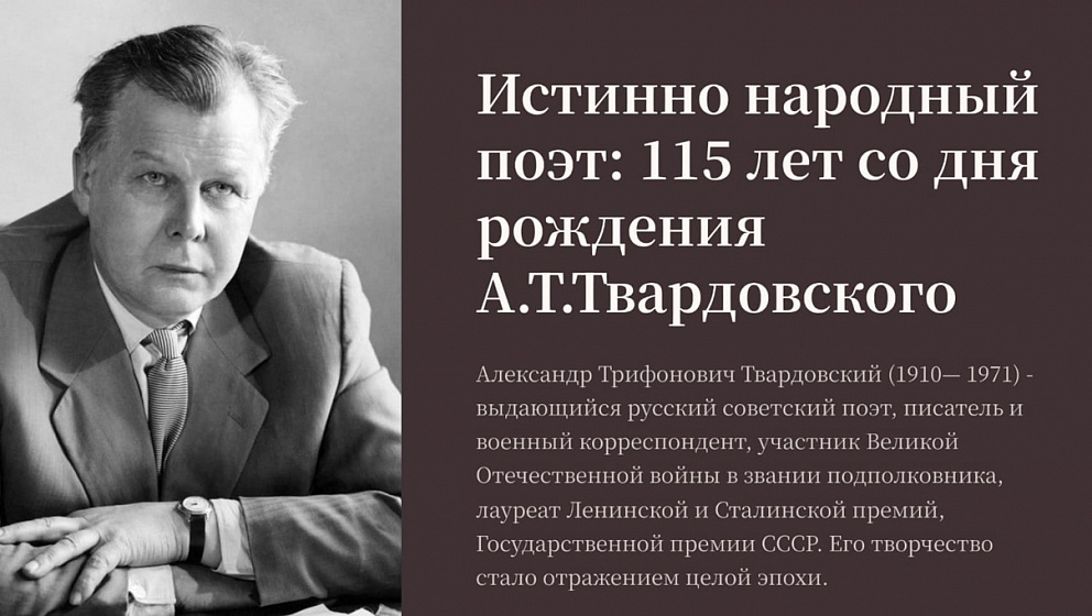 21 июня исполняется 115 лет со дня рождения Александра Трифоновича Твардовского - выдающегося советского поэта, прозаика и военного корреспондента, лауреата Сталинской и Ленинской премий.