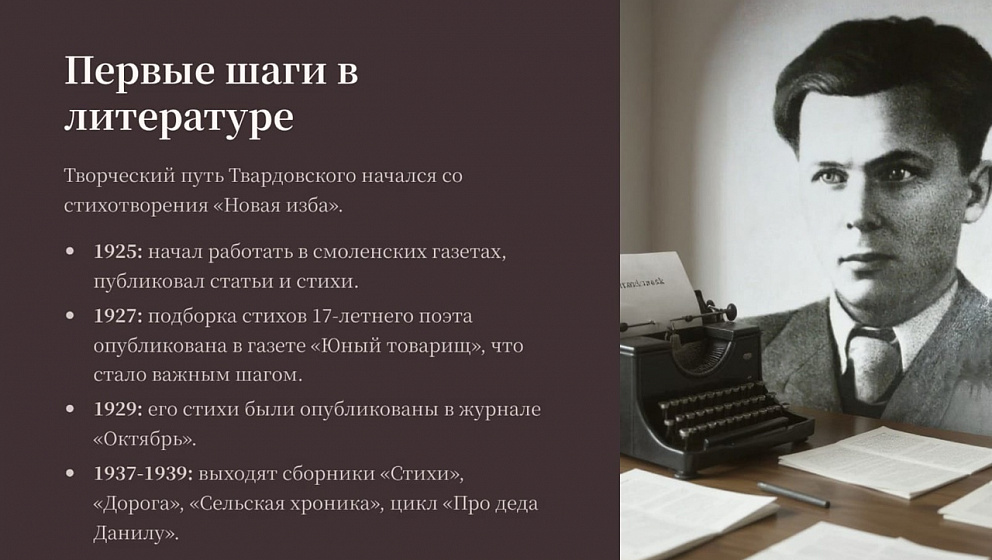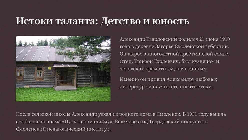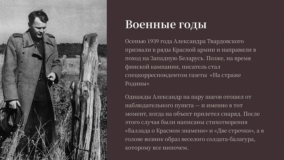 Его называли классиком соцреализма и выразителем передовых идей и чаяний своего времени. Участник Советско-финской и Великой Отечественной войны А.Т.Твардовский в качестве военного корреспондента прошел боевой путь от Москвы до Кенигсберга, встретив Победу в звании подполковника Красной Армии.