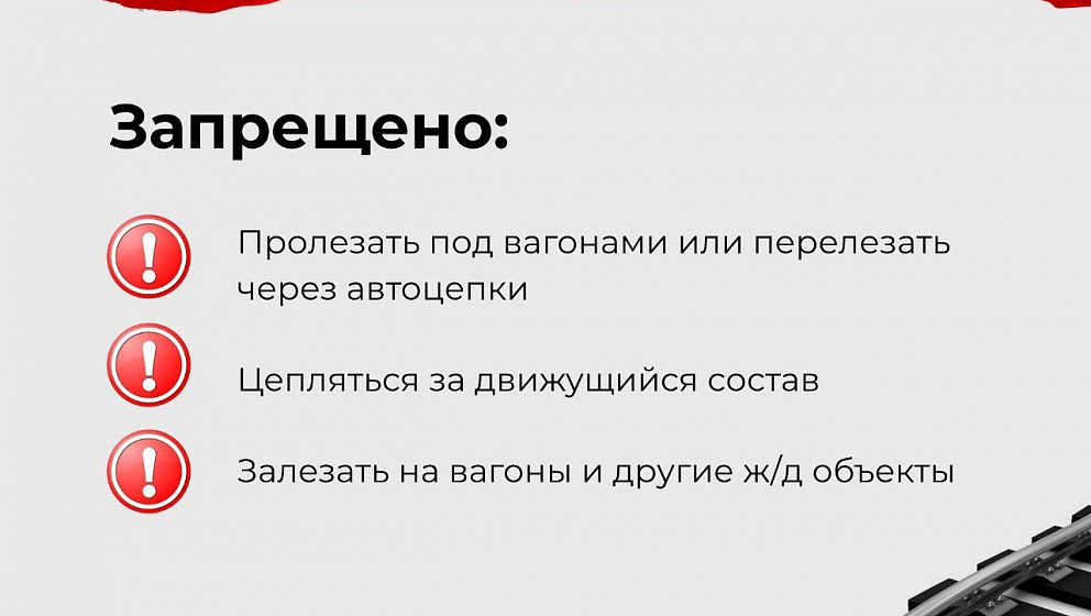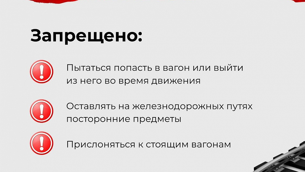 - Проезд на крышах и подножках вагонов, переходных площадках и в тамбурах вагонов, а также на грузовых поездах категорически запрещен.